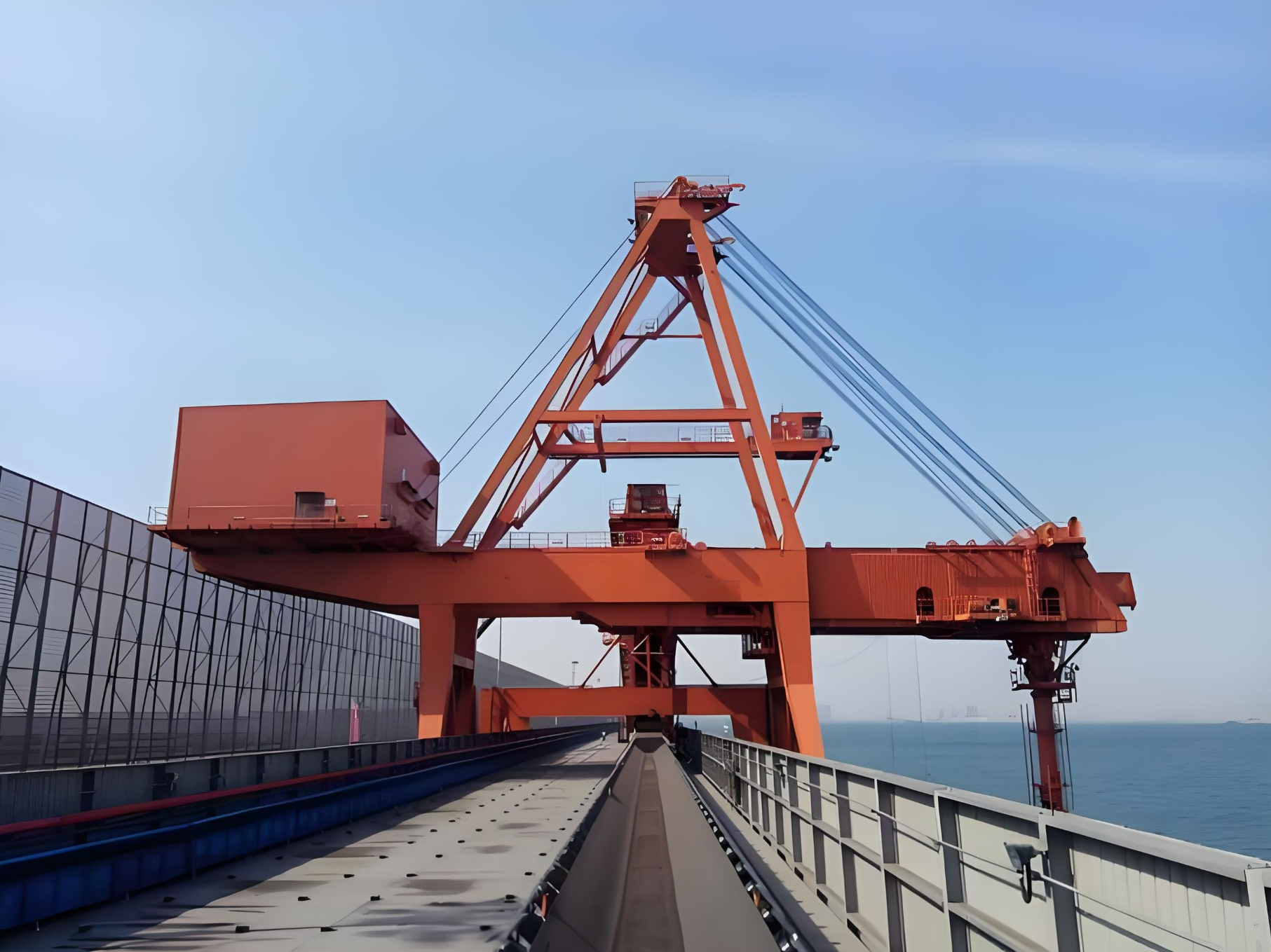 大型橋式抓斗卸船機是用來將固態散裝貨物從船艙運至碼頭上的煤料傳送帶上的大型設備。